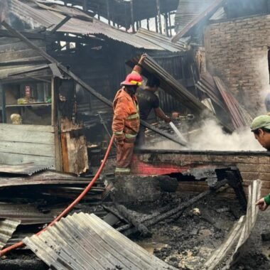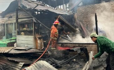 Petugas Damkar Pemkab Karo sedang berusaha menginginkan api yang sebelumnya membakar 4 unit rumah warga Desa Tanjung Barus, Kecamatan Barus...