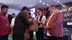 Abetnego Tarigan mendapat dan Edy Suranta Bukit menyapa Ketua Umum Moderamen GBKP Pdt. Krismas Imanta Barus.(ist)