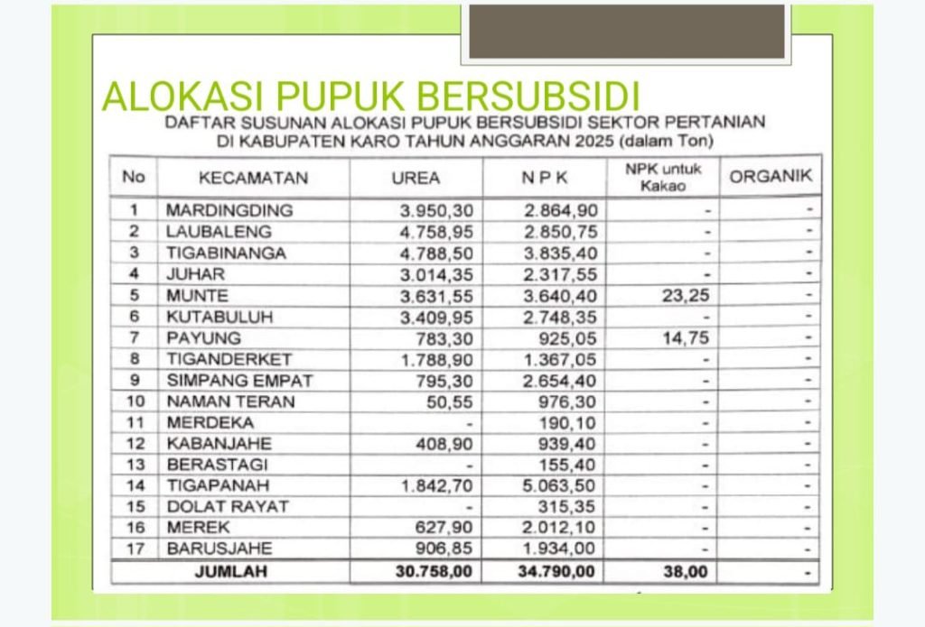 Jumlah besaran alokasi pupuk bersubsidi per- Kecamatan se-Kabupaten Karo tahun 2025.(ist)
