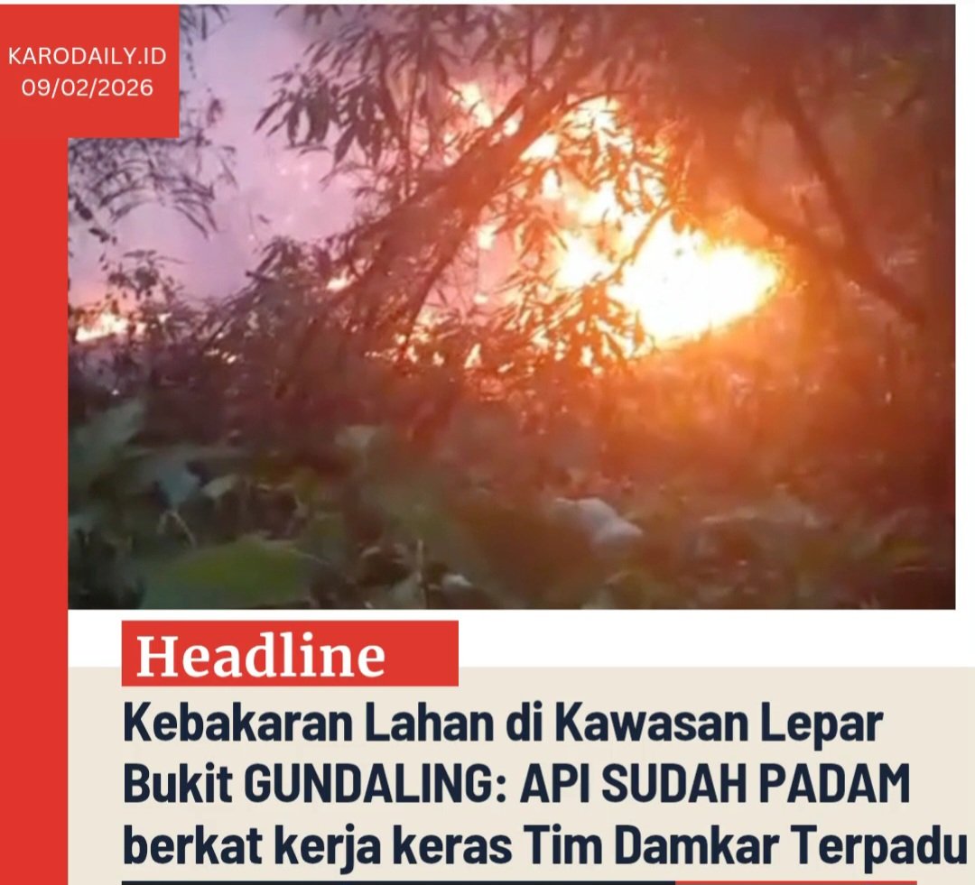 Kebakaran lahan di Bukit Gundaling, Karo.(dok) KARODAILY.id, Kabanjahe – Kebakaran hutan dan lahan (karhutla) terjadi di kawasan Punggung Bukit Gundaling, Desa Merdeka, Kabupaten Karo, Senin (09/02/2026) sore. Laporan kebakaran diterima Pos Pemadam Kebakaran (Damkar) Kabanjahe pada pukul 18.52 WIB...