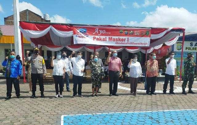 Forkominda Karo dan para Bacalon bupati/wakil bupati Karo pada gelar gerakan ayo pakai masker.(ist). KARODAILY.id, Kabanjahe - Kapolres Karo AKBP Yustinus Setyo Indriyono SIK SH minta seluruh bakal calon bupati/wakil bupati Karo ikuti protokol kesehatan selama menjalani tahapan pelaksanaan pemilihan...