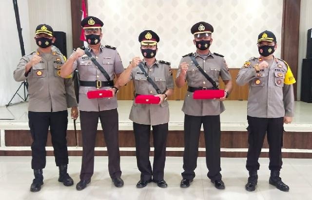 Kapolres Tanah Karo dan para mantan pejabat utama Polres Tanah Karo.(istimewa). KARODAILY.id, Kabanjahe- Kapolres Karo AKBP Yustinus Setyo Indriyono SH SIK memimpin upacara serah terima jabatan (sertijab) tiga pejabat utama Polres Karo di ruang Pur-pur Sage Mapolres Karo, Senin (31/08/2020)....