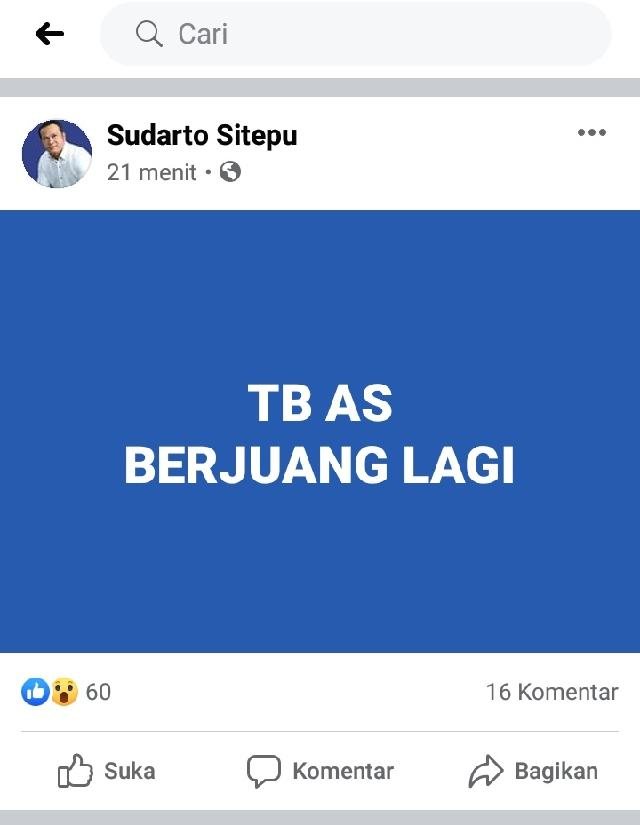 Tangkapan layar di akun FB Sudarto Sitepu.(net/FB). KARODAILY.id, Berastagi - Terkelin Brahmana kemungkinan besar meraih rekomendasi partai politik tersisa untuk mengikuti pemilihan kepala daerah (Pilkada) serentak di Karo 9 Desember 2020. Meski begitu, kepastian akan hal ini masih menunggu keputusan...