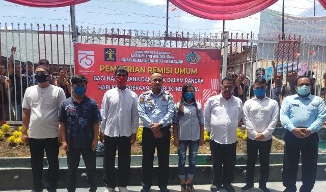 Ka. Rutan Kabanjahe dan narapidana penerima remisi usai upacara HUT RI ke - 75.(istimewa). KARODAILY.id,Kabanjahe - 72 orang narapidana Rumah Tahanan Negara ( Rutan) kelas II B Kabanjahe terima remisi HUT RI ke-75. Enam orang diantaranya langsung mendapatkan hadiah kebebasan....
