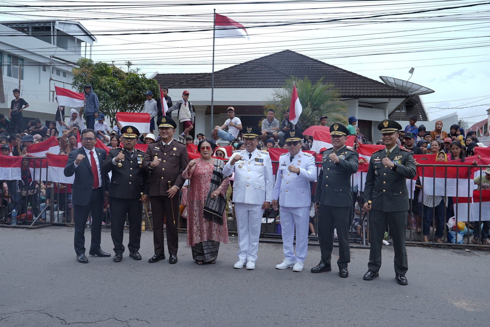 Bupati Karo Antonius Ginting dan Wakil Bupati Karo Komando Tarigan serta Ketua DPRD Karo Iriani Br Tarigan dan unsur Forkopimda Karo di depan podium utama penerimaan defile HUT RI ke - 80.(ist) KARODAILY.id, Kabanjahe - Bupati Karo Brigjen Pol (Purn)...