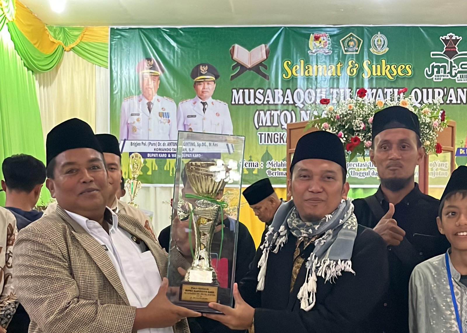 Ketua Panitia MTQ Nasional ke - XXIII Tingkat Kabupaten Karo Dapat Kita Sinulingga serahkan trophy juara umum kepada kontingen Kecamatan Mardingding.(ist) KARODAILY.id, Kabanjahe - Musabaqah Tilawatil Qur'an (MTQ) Nasional ke – XXIII Tingkat Kabupaten Karo Tahun 2025/1446 H, Rabu (04/06/2025)...