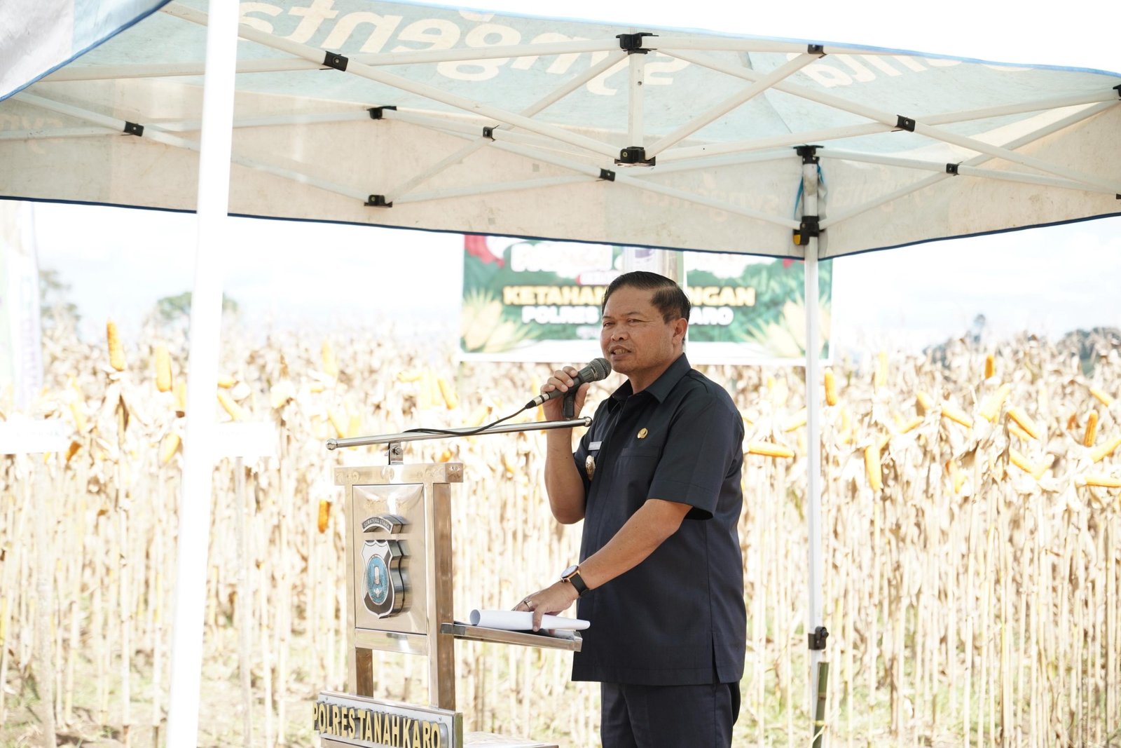 Wakil Bupati Karo Komando Tarigan dan Waka Polres Tanah Karo Kompol Zulham bersama tamu undangan lainnya memetik jagung saat gelar panen raya jagung Gugus Tugas Ketahanan Pangan Polri di jajaran Polres Tanah Karo.(ist) KARODAILY.id, Tiga Binanga – Hadiri panen jagung...