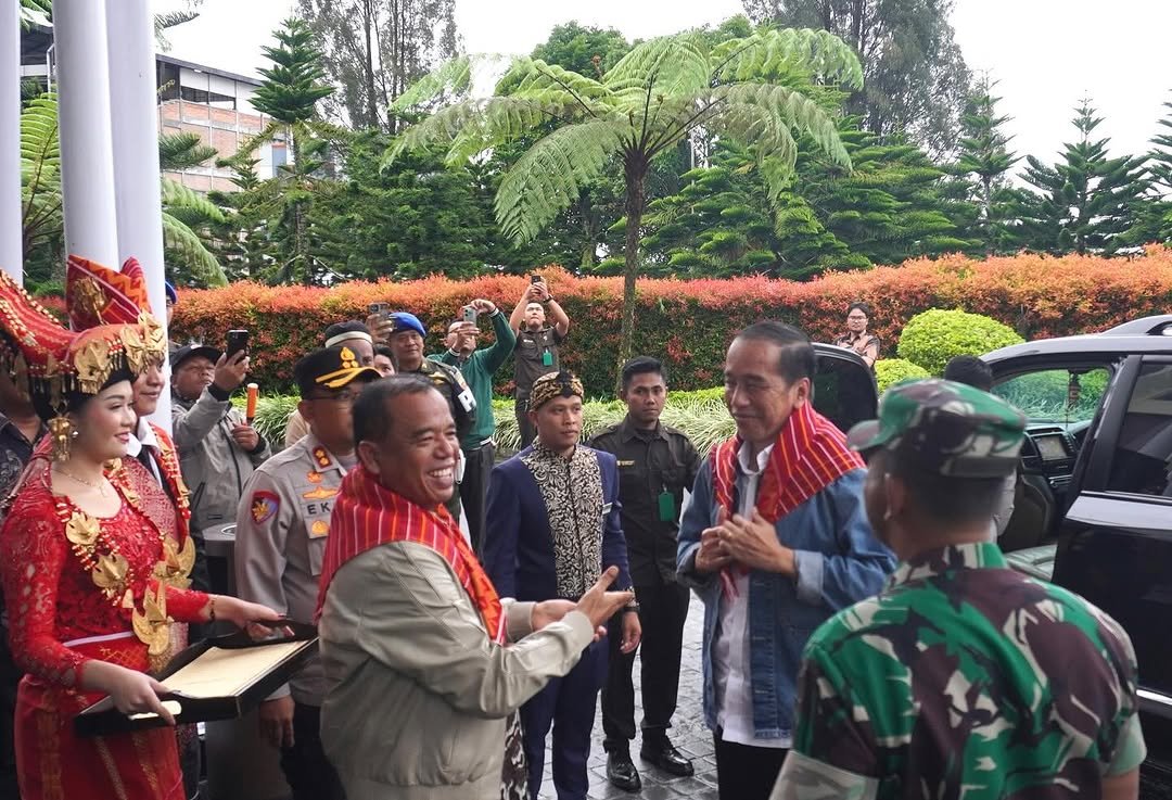 Bupati Karo Antonius Ginting tertawa lepas usai memberikan salam Mejuah juah dan Uis Beka Buluh kepada Presiden RI ke-7 Joko Widodo di Mikie Holiday Resort Berastagi.(ist) KARODAILY.id, Berastagi - Bupati Karo Brigjen Pol (P) Dr.dr.Antonius Ginting, Sp.OG, M.Kes sambut kedatangan...