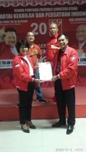 Serah terima rekomendasi dari DPP PKPI berlangsung di Kantor Dewan Pimpinan Propinsi (DPP) PKPI Sumut di Medan, Kamis (03/09/ 2020). Jusua dan Saberina menerima berkas rekomendasi dengan didampingi Ketua DPD PKPI Karo Nawari Sembiring.