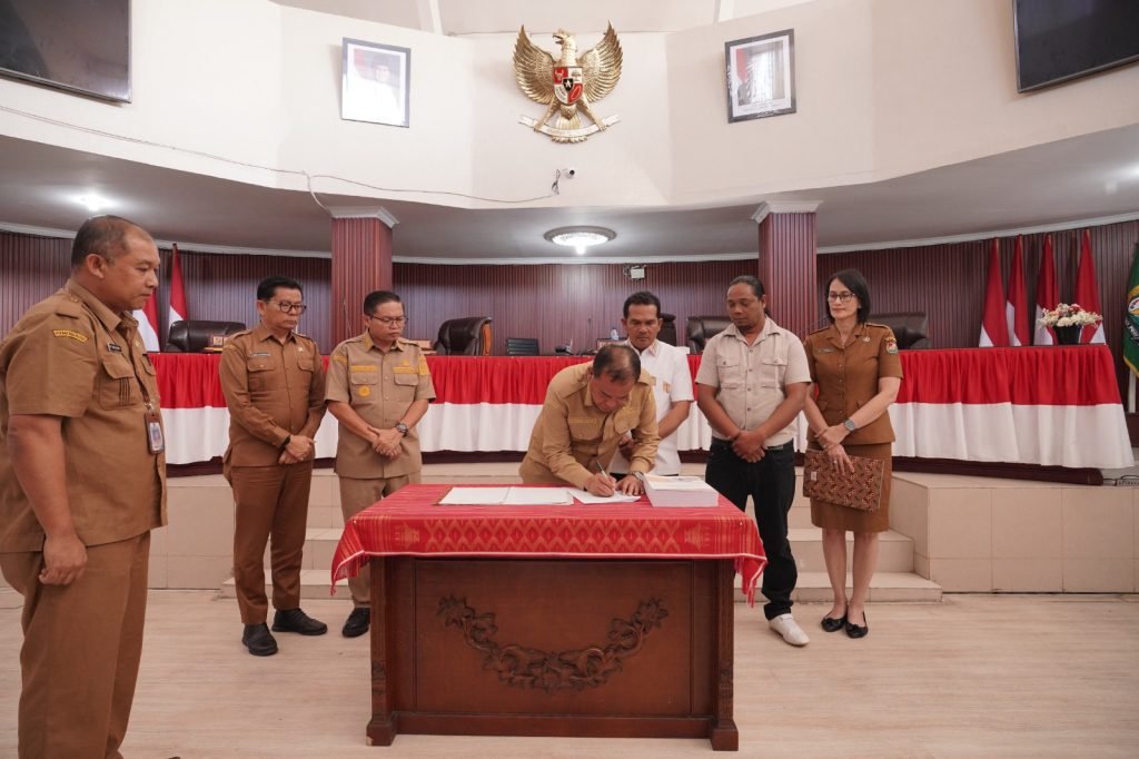 Usai penyampaian pidato, Bupati Karo Antonius Ginting dan Wakil Ketua DPRD Karo Imanuel Sembiring menandatangani berita acara Rancangan Peraturan Daerah tentang Pertanggungjawaban Pelaksanaan APBD Kabupaten Karo Tahun 2024.