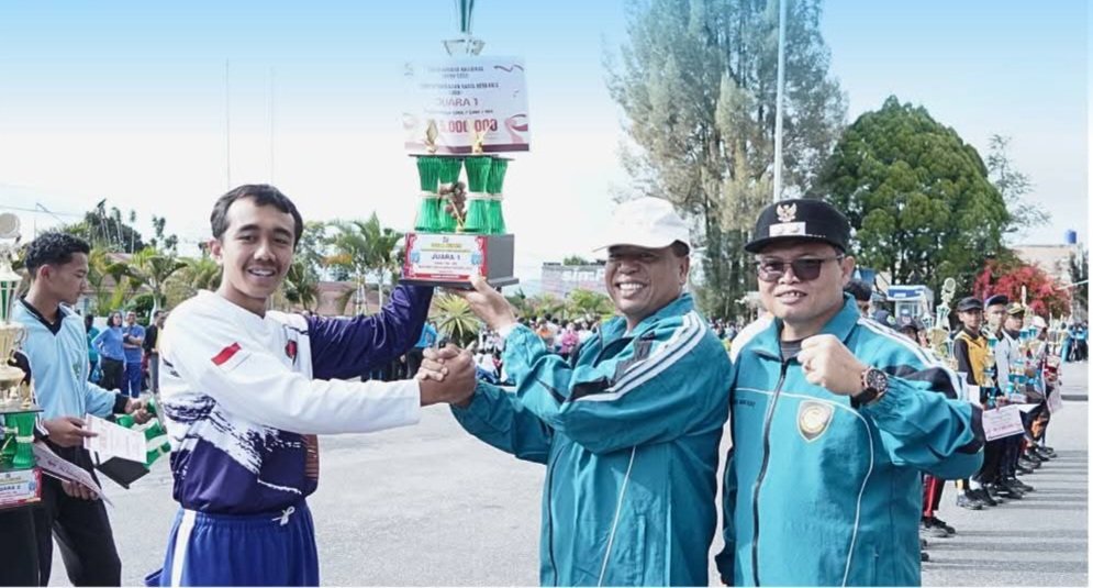 Bupati Karo Antonius Ginting dan Wakil Bupati Karo Komando Tarigan serahkan trophy bagi pemenang LKBB Karo 2025 usai Upacara Peringatan Haornas 2025.(ist)