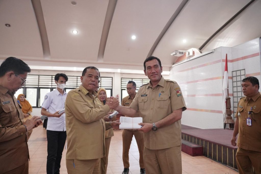 Bupati Karo Antonius Ginting secara simbolis serahkan berkas tunggakan pembayaran BPJS Kesehatan ke Camat Berastagi David Cardona Sembiring.(ist)