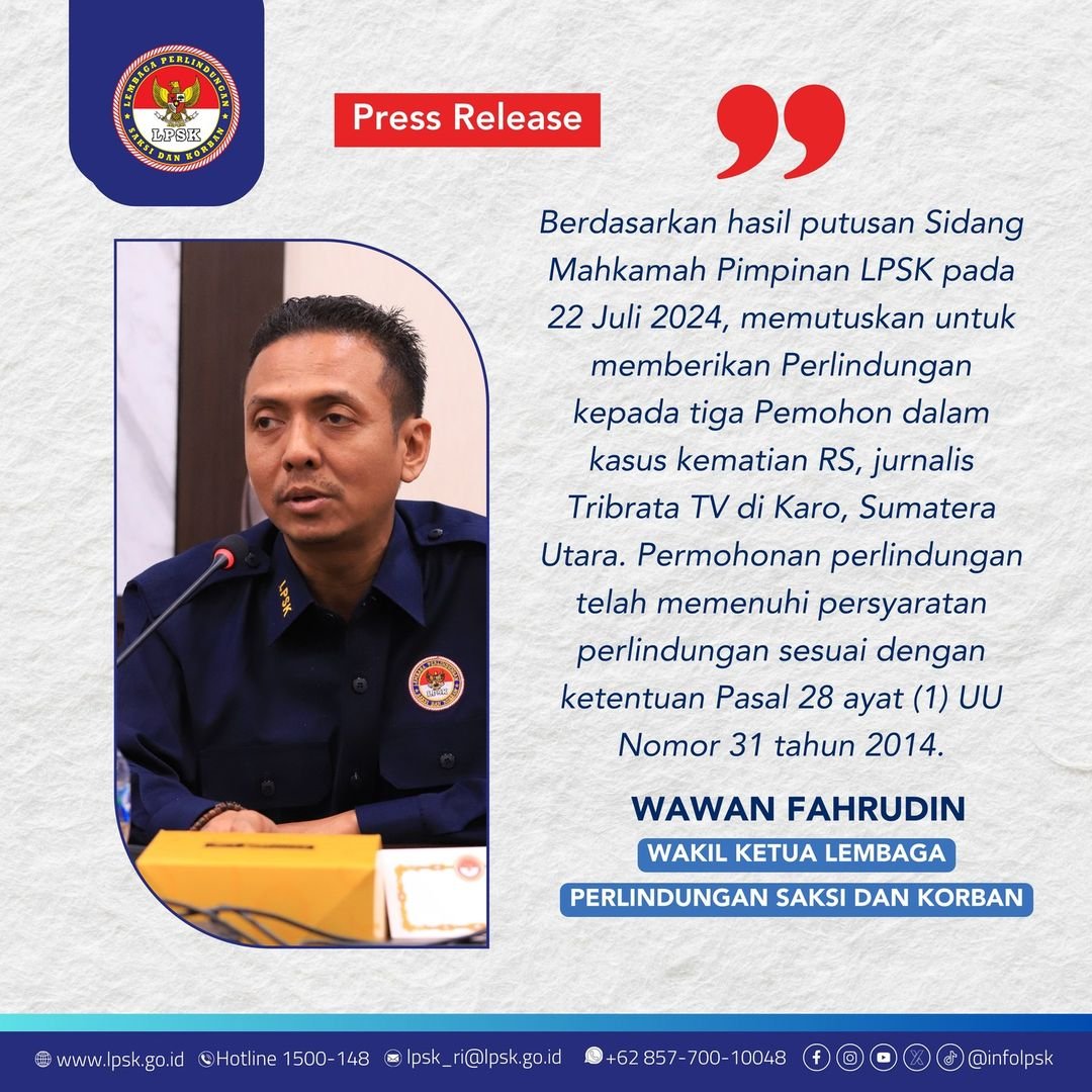 Rilis LPSK terkait perlindungan kepada tiga anggota keluarga almarhum wartawan Tribrata TV.(ist/igLPSK) KARODAILY.id, Jakarta - Lembaga Perlindungan Saksi dan Korban (LPSK) memberikan perlindungan kepada keluarga Rico Sempurna Pasaribu atas kasus pembakaran rumah yang mengakibatkan hilangnya nyawa. Sebagaimana dilansir tirto.id, terdapat...
