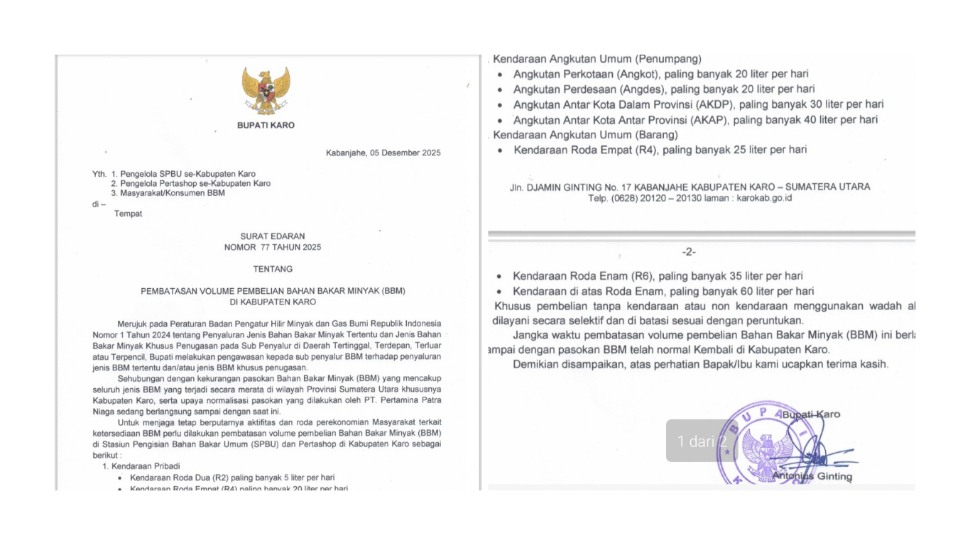 Surat edaran pembatasan pembelian BBM di SPBU yang ada di Kabupaten Karo.(ist) KARODAILY.id, Kabanjahe – Bupati Karo Brigjen Pol (Purn) Dr.dr.Antonius Ginting,Sp.Og,M.Kes, resmi mengumumkan pembatasan volume pembelian Bahan Bakar Minyak (BBM) di seluruh SPBU dan Pertashop se-Kabupaten Karo. Kebijakan ini...