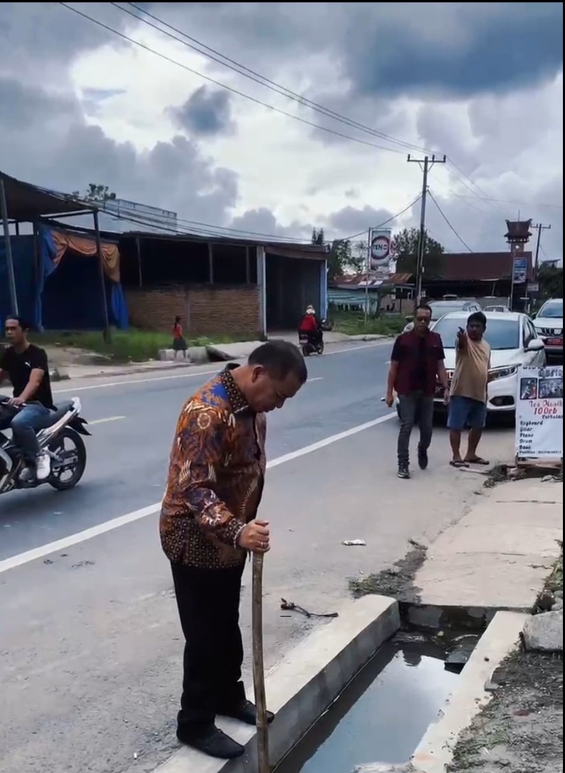 Bupati Karo Antonius Ginting saat mengukur langsung dimensi saluran drainase di jalan nasional Tiga Panah beberapa waktu lalu.(ist) KARODAILY.id, Tiga Panah - Pemkab Karo melalui Dinas PUTR Karo siapkan pembangunan sistem drainase dari Tiga Panah dengan titik akhir pembuangan ke...
