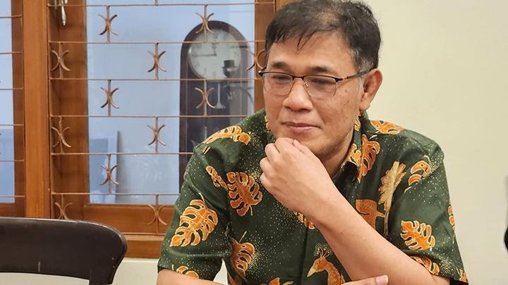 Budiman Sudjatmiko, pendukung Prabowo Subianto, calon presiden pada Pemilu 2024, berbicara tentang tipe pemimpin Indonesia masa depan dalam diskusi "Perhimpunan Nasional Enam Agenda Indonesia Emas 2045" di sekretariat Pimpinan Pusat Dewan Prabowo Budiman Bersatu alias Prabu, di Jalan Maluku, Menteng,...