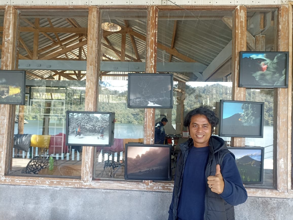 "Sang Pembidik" Dedi Sinuhaji dengan latar belakang karya fotonya seputar Bencana erupsi GA Sinabung.(ist). KARODAILY.id, Karo - Pewarta Foto Senior, Dedi Sinuhaji warnai event Sinabung Art Festival (SAF) 2023 di Villa Mari Pro Lau Kawar yang terletak di Desa Kuta...
