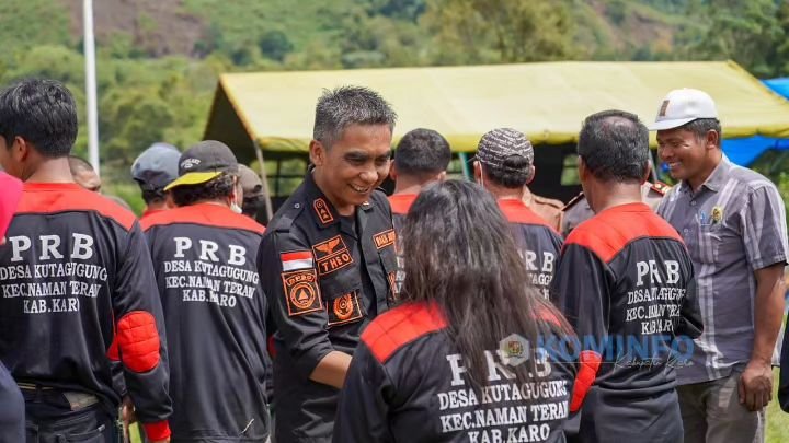 Wakil Bupati Karo Theopilus Ginting semangati peserta sosialisasi penanganan resiko bencana.(kominfokaro) KARODAILY.id - Pemerintah Desa (Pemdes) Kuta Gugung, Kecamatan Namanteran, Kabupaten Karo menggelar simulasi kesiapsiagaan pengurangan resiko bencana erupsi Gunung Sinabung di Losd Desa dan Lapangan Kuta Gugung, Selasa (25/06/2024)...