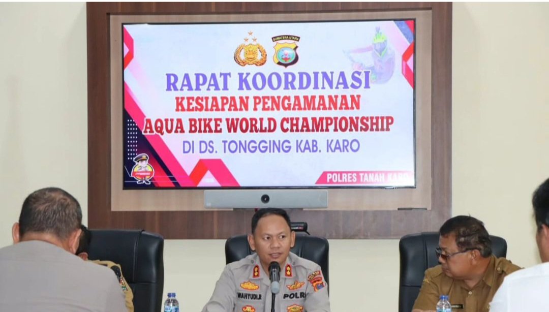 Kapolres Tanah Karo AKBP Wahyudi Rahman saat pimpin Rakorpam Aquabike World Championship 2023.(ist/ighumaspolrestanahkaro) KARODAILY.id, Kabanjahe - Kapolres Tanah Karo AKBP Wahyudi Rahman, S.H.,S.I.K.,M.M., CPHR, CBA, pimpin rapat koordinasi pengamanan Aquabike World Championship 2023, Senin (18/09/2023) di ruang Vidcon Mapolres Tanah...