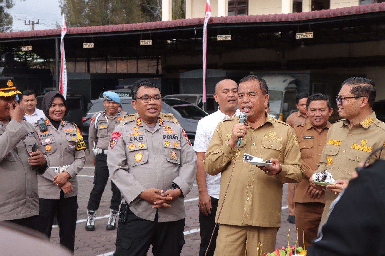 Bupati Karo Antonius Ginting dan Wakil Bupati Karo Komando Tarigan sampaikan sambutan pada perayaan HUT ke - 46 Kapolres Tanah Karo AKBP Eko Yulianto.(ist) KARODAILY.id, Kabanjahe - Perayaan ulang tahun Kapolres Tanah Karo AKBP Eko Yulianto, S.H., S.I.K., M.M., M.Tr.Opsla...
