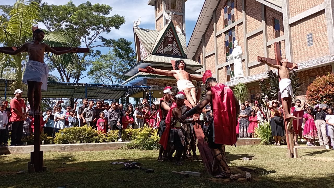 Prajurit Romawi menurunkan jasad Yesus dari kayu salib sesaat setelah Yesus wafat. Adegan diperagakan pada teatrikal jalan salib pada perayaan Jumat Agung di Gereja Katolik SPP Kabanjahe.(ist) KARODAILY.id, Kabanjahe - Aksi teatrikal jalan salib tersaji dramatis dalam perayaan Jumat Agung...