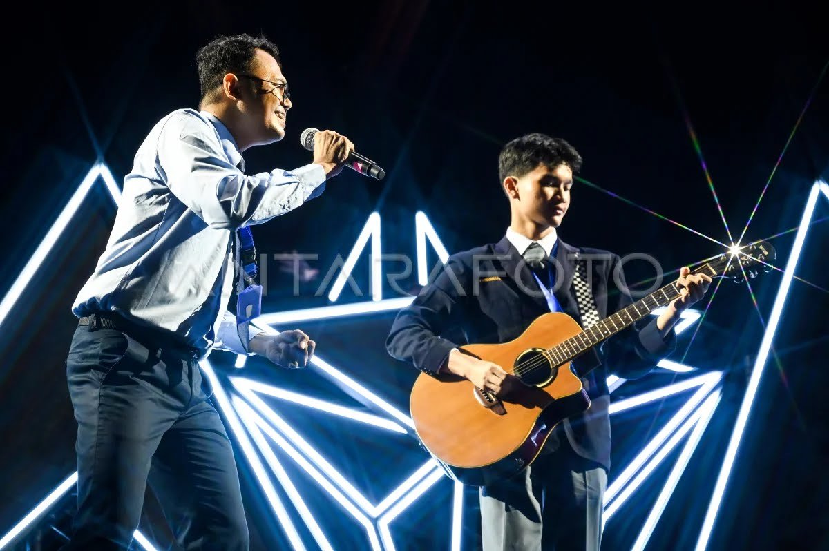 Guru musik Tri Adinata (kiri) bersama pelajar dari SMA Al-Azhar Medan bernyanyi pada konser Walker World Asia Tour Part 1 di Jakarta, Sabtu (8/6/2024). Dalam konsernya, Alan Walker berkolaborasi dengan penyanyi Indonesia Putri Ariani serta pelajar dari SMA Al-Azhar Medan...