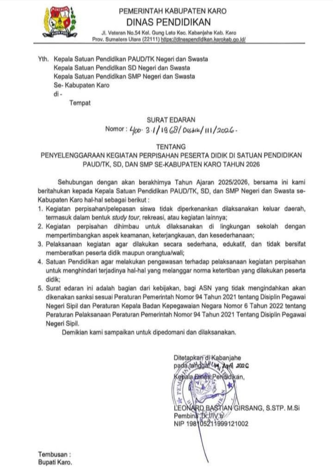 Surat edaran ini ditetapkan di Kabanjahe pada 14 April 2026 dan ditandatangani oleh Kepala Dinas Pendidikan Kabupaten Karo, Leonard Bastian Girsang, S.STP., M.Si.