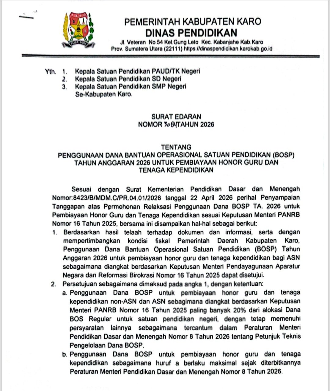 Surat edaran yang ditetapkan di Kabanjahe pada 23 April 2026 itu ditandatangani oleh Kepala Dinas Pendidikan Kabupaten Karo, Leonardo Bastian Girsang. Regulasi ini merujuk pada surat dari Kementerian Pendidikan Dasar dan Menengah tertanggal 22 April 2026 yang memberikan relaksasi penggunaan dana BOSP, terutama dalam pembiayaan honor tenaga kependidikan.