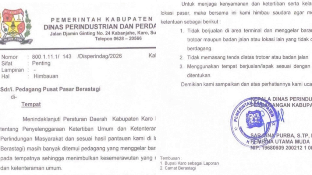 KARODAILY.id, Kabanjahe – Dinas Perindustrian dan Perdagangan (Disperindag) Kabupaten Karo mengeluarkan surat himbauan kepada seluruh pedagang di Pusat Pasar Berastagi agar mematuhi ketentuan ketertiban dalam berjualan.