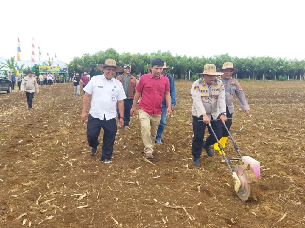 Kapolres Tanah Karo AKBP Eko Yulianto memimpin proses penanaman bibit jagung di Kecamatan Kuta Buluh.(ist)