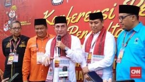 Bakal calon Gubernur Sumut Edy Rahmayadi dan wakilnya resmi mendaftar ke Komisi Pemilihan Umum (KPU) Sumut, Kamis (29/8/2024). (CNN Indonesia/Farida)