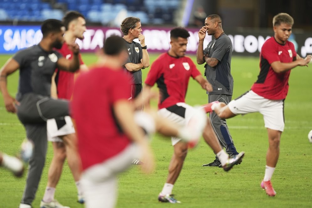Pelatih Patrick Kluivert dan Asisten Pelatih, Alex Pastoor berdiskusi di sela-sela latihan Timnas Indonesia jelang lawan Australia. (c) AP Photo/Mark Baker