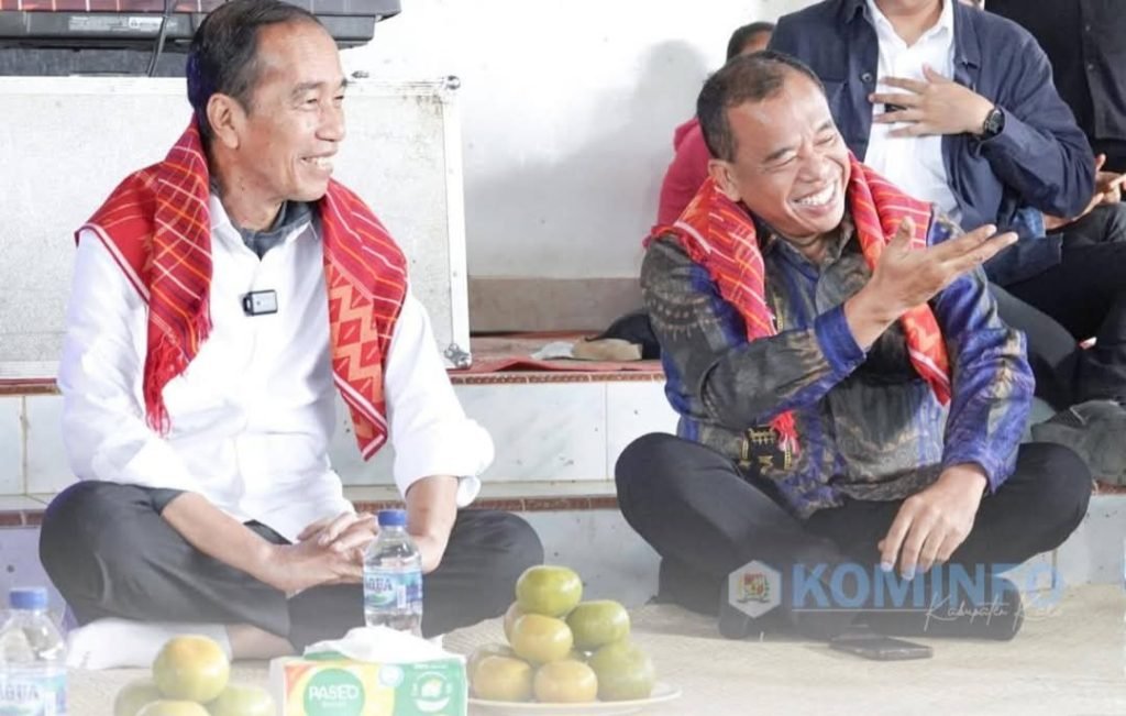 Presiden RI ke – 7 Joko Widodo dan Bupati Karo Antonius Ginting tertawa lepas saat berada di Jambur Desa Kutambelin.(ist/kominfokaro)