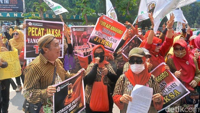 Sebagaimana dilansir detikSumut di lokasi, Senin (20/4/2026), terpantau massa aksi menggenakan pakaian khas Jawa. Massa juga menyampaikan orasi dan tuntutan, bahkan mencoba masuk ke PN dengan menggoyang pagar dan melemparkan air ke penjaga gerbang.