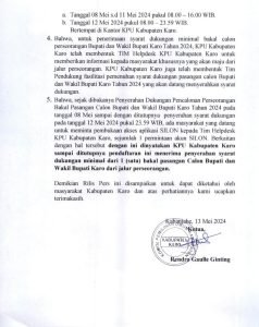 Sebagaimana diberitakan sebelumnya, tahapan dan jadwal serta syarat dukungan bakal pasangan calon (Bapaslon) bupati dan wakil bupati dari jalur perseorangan di Pilkada 2024 dimulai dengan pengumuman persiapan penyerahan dukungan perseorangan pada tanggal 5-7 Mei 2024.