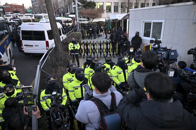 Polisi dan penyelidik anti-korupsi tiba di kediaman Presiden Korea Selatan yang dimakzulkan Yoon Suk Yeol di Seoul, Korea Selatan, Jumat (3/1/2025). Foto: Jung Yeon-je/AFP
