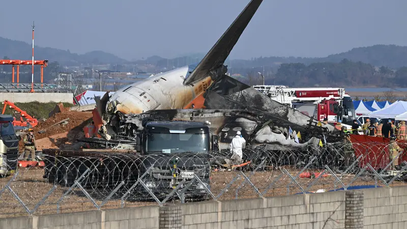 Petugas pemadam kebakaran dan petugas penyelamat bekerja di dekat reruntuhan pesawat Jeju Air Boeing 737-800 di Bandara Internasional Muan di Provinsi Jeolla Selatan, sekitar 288 kilometer sebelah barat daya Seoul pada tanggal 29 Desember 2024. (JUNG YEON-JE/AFP)