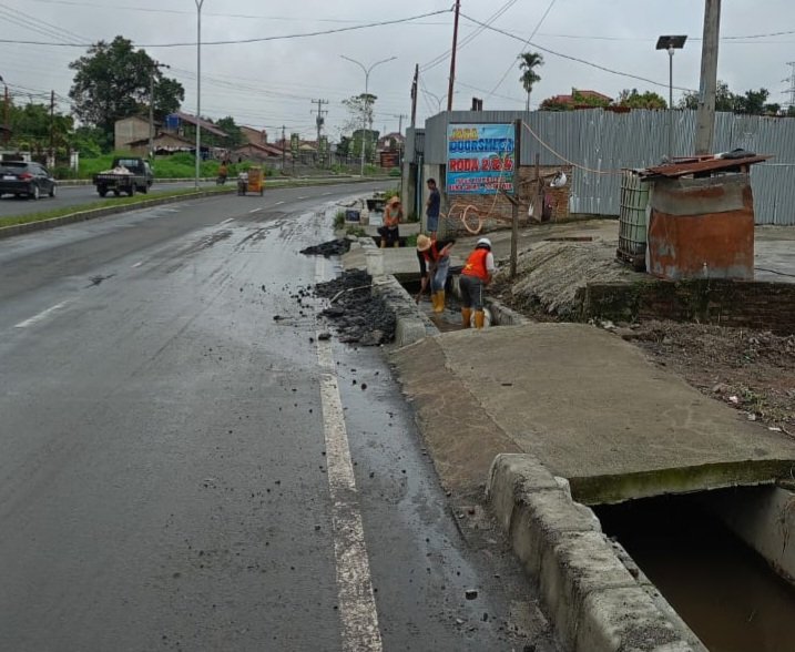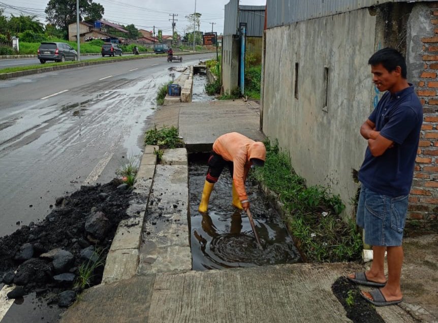 Normalisasi jalur drainase adalah salah satu langkah mengurangi debit air berlebih ke badan jalan. (karodaily/nanang).