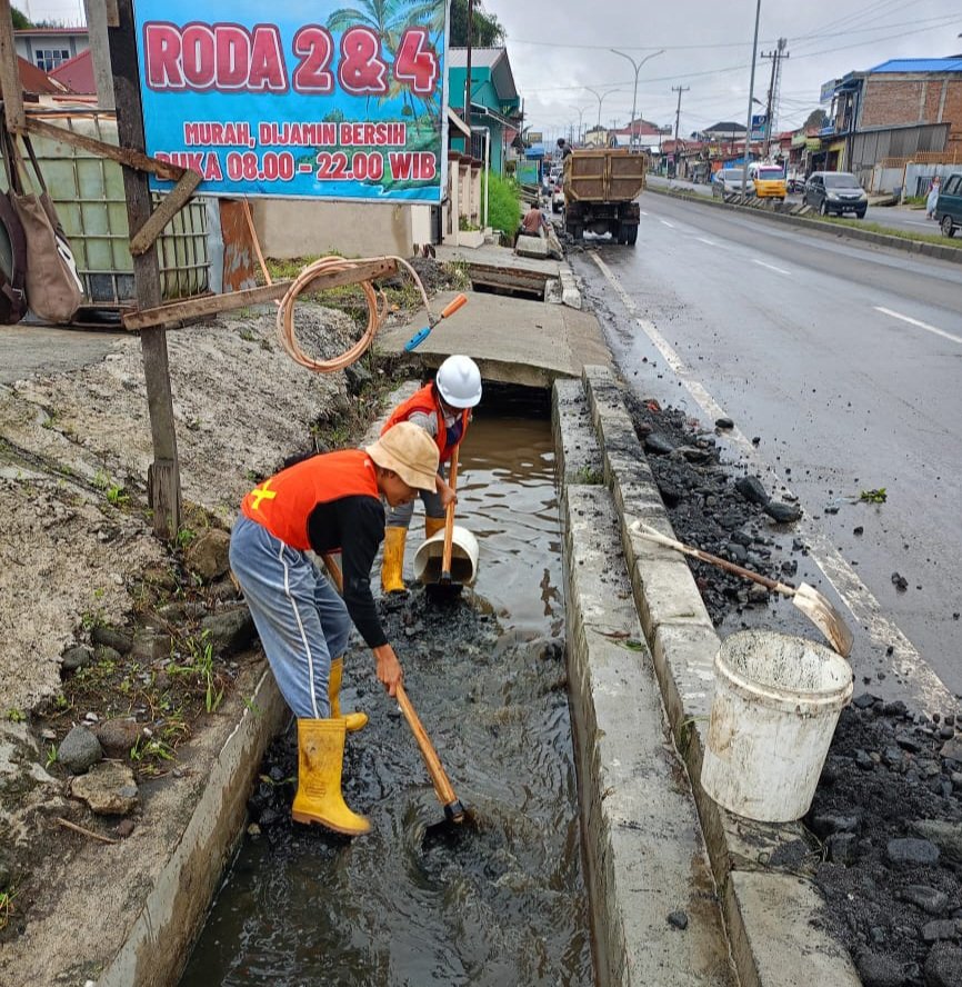 Petugas Dinas PUTR Karo laksanakan normalisasi parit dengan mengangkat sedimen dari saluran drainase di jalan Beraatagi – Kabanjahe guna menghindari luapan air.(ist)