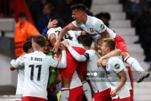 Blunder yang dilakukan Eriksen membuka peluang Lammers untuk menjebol gawang Andre Onana dari jarak dekat.(karodaily).